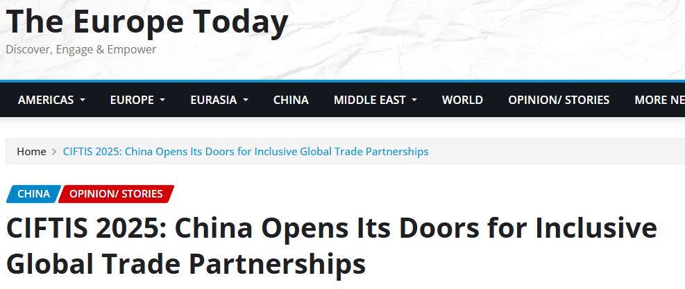 今日歐洲網站(The Europe Today)13日的報道指出,服貿會展示了中國對包容、開放和前瞻性的服務貿易的承諾。中國持續擴大市場準入,為全球企業創造廣闊機遇。