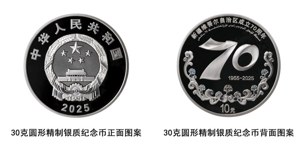 該套紀念幣正面圖案均為中華人民共和國國徽,并刊國名、年號;背面圖案均為新疆維吾爾自治區成立70周年慶祝活動標識,輔以石榴花、卷草紋裝飾組合設計,并刊“新疆維吾爾自治區成立70周年”國家通用語言文字、維吾爾文字樣及面額。