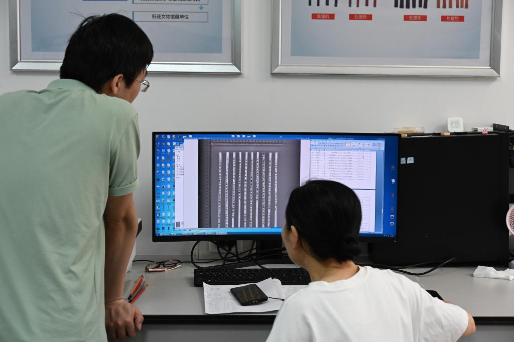 在荊州文物保護(hù)中心,工作人員檢查掃描后的竹簡(jiǎn)文字。新華社記者黃曉勇 攝