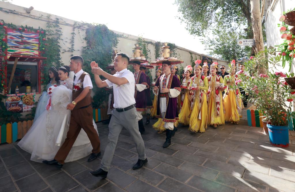 7月22日,在新疆庫車市的龜茲小巷,表演薩瑪瓦爾舞的演員參與當地的一場婚禮活動。新華社記者 王菲 攝