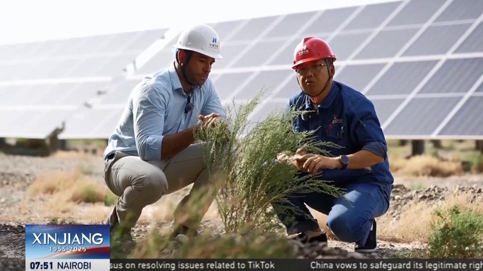 外籍主持人林肯探訪了全球最大的“草光互補”光伏基地——阿合雅光伏產業園。這片由181萬塊光伏板組成的藍色海洋,占地493公頃,相當于700個標準足球場。不僅能夠提供滿足約43萬人全年用電需求,還兼具治沙功效。中國華能集團烏什光伏電站負責人周博表示,這類光伏設施能夠穩固土壤、防止侵蝕,板面凝結的水珠還可灌溉下方土地,支持植物持續生長?!案瓯谄孥E”的背后,是國家實現“雙碳”目標而推動的生態與能源的“雙向奔赴”。