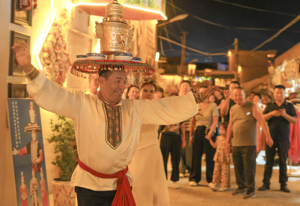 夜幕降臨,煙火氣息在庫車老城彌漫。廣場上傳來歡快的樂曲聲,舞者頭頂銅盤銅壺,腳步輕快,將迎賓之禮——薩瑪瓦爾舞展現在游客面前,掌聲與歡笑聲此起彼伏。