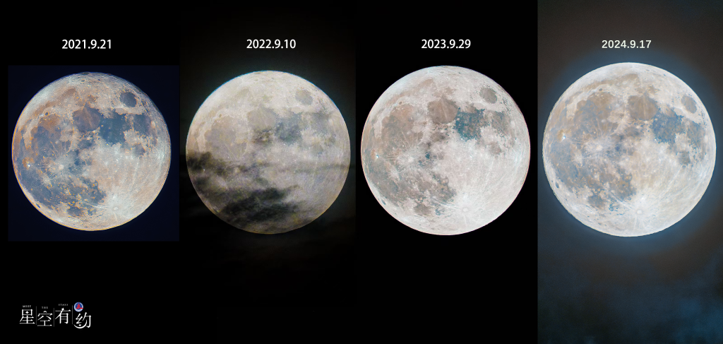 連續四年在廣西南寧市拍攝的中秋月特寫(拼版)。(王晉 攝)
