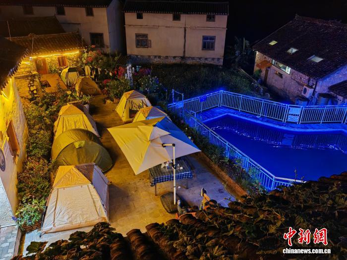 10月3日,游客在貴州省貞豐縣平街鄉(xiāng)花江村村民林國(guó)權(quán)的民宿院子內(nèi)搭帳篷。(受訪者供圖)