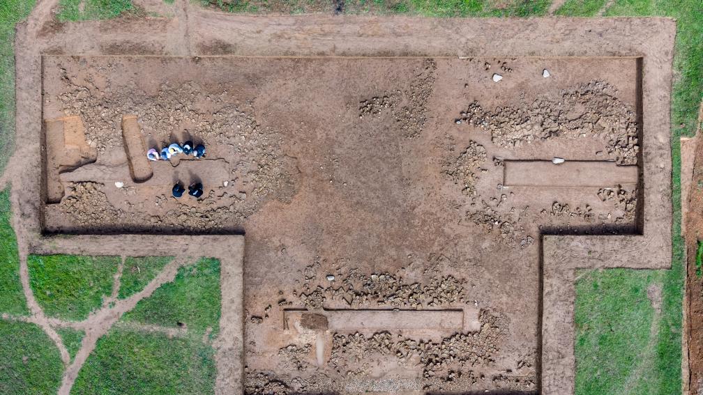 10月15日,在甘肅省隴南市禮縣四角坪遺址考古發掘現場,考古工作人員觀察一處闕門遺跡(無人機照片)。新華社記者 郎兵兵 攝