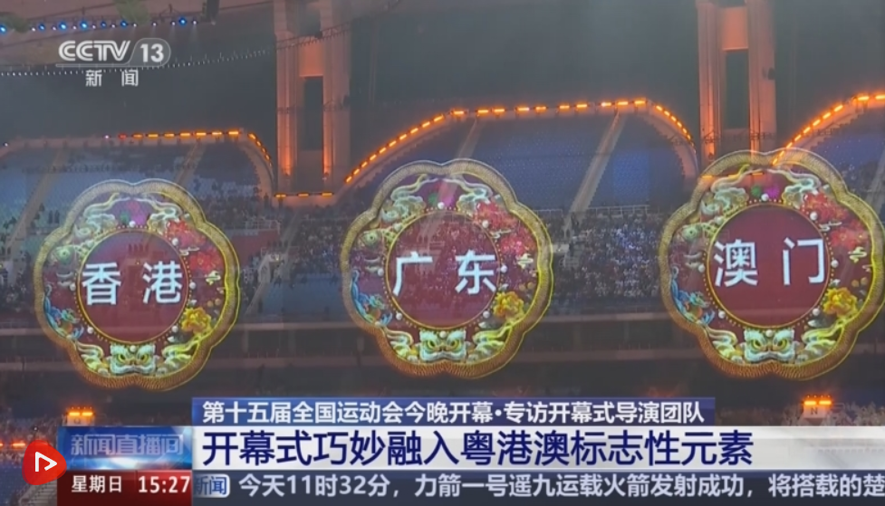 作為首次由粵港澳三地聯合承辦的全國運動會,十五運會開幕式巧妙融入香港維多利亞港、澳門大三巴、廣州“小蠻腰”等標志性元素,展現粵港澳大灣區互聯互通的蓬勃生機。十五運會開幕式總監制劉偉強介紹,粵港澳有很多共通的元素,劃龍舟的端午節也是一樣,中秋節也是一樣,從小看黃飛鴻、葉問這些。