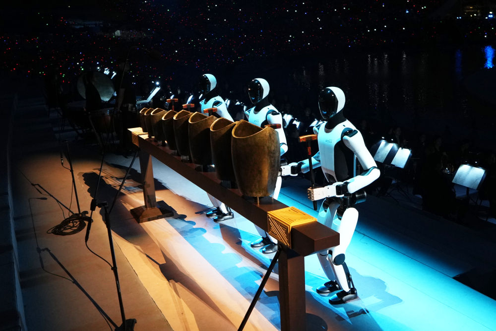 11月9日,開幕式上的工業(yè)人形機器人敲響千年前的中國古代樂器青銅句鑃。新華社記者 李一博 攝