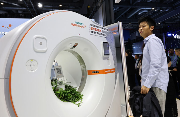 2025年11月6日,參觀者在進(jìn)博會(huì)西門子公司展臺(tái)一個(gè)CT機(jī)展品旁駐足觀看,這是西門子公司首款國(guó)產(chǎn)雙源光子計(jì)數(shù)CT,也是該產(chǎn)品亞洲首發(fā)首展。新華社記者 方喆 攝