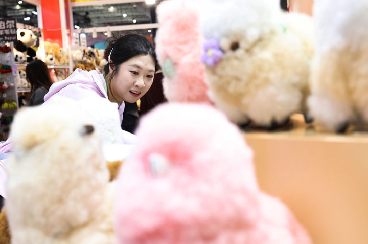 2025年11月8日,在第八屆進(jìn)博會(huì)消費(fèi)品展區(qū),參觀者在秘魯溫暖駝品牌的羊駝毛制品前駐足觀看。新華社記者 方喆 攝