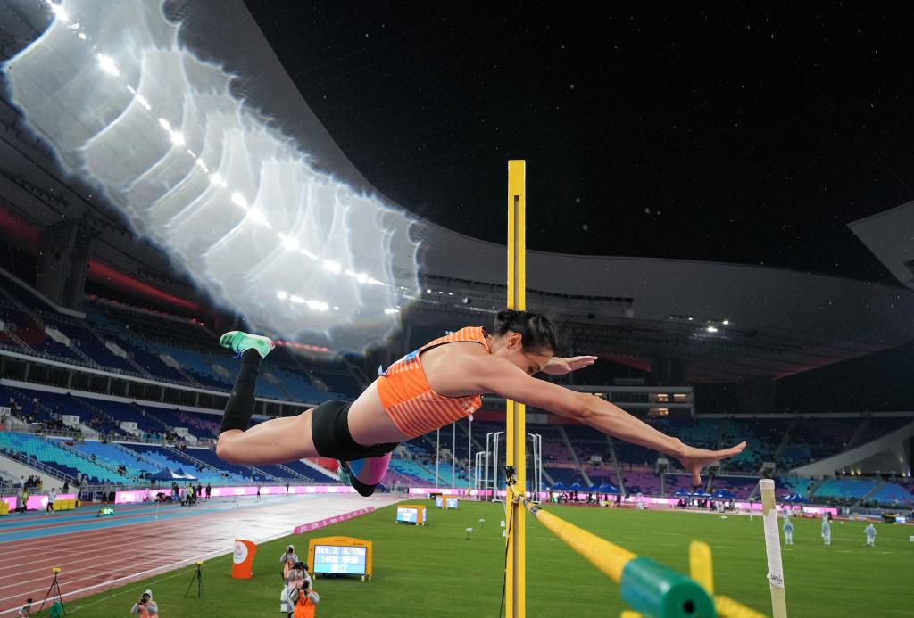 11月18日,浙江隊選手李玲在女子撐桿跳高決賽中。