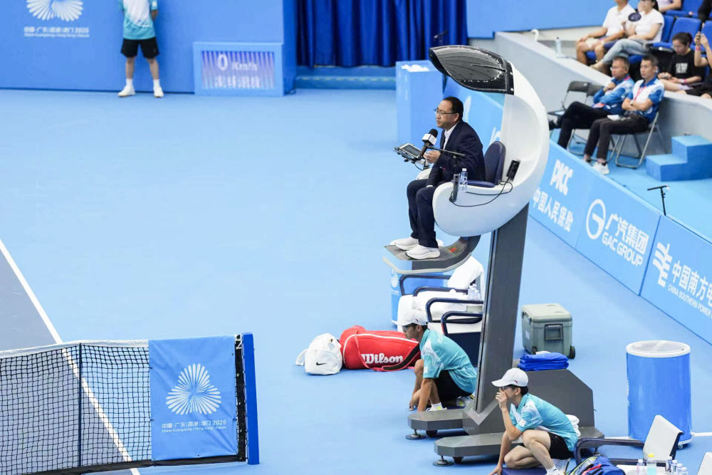 這是11月15日在廣東珠海橫琴網球中心拍攝的智能電動升降裁判椅。