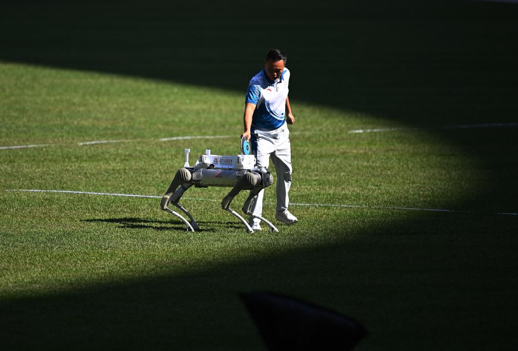 11月16日,在田徑男子十項全能鐵餅比賽中,機器人在運送鐵餅。