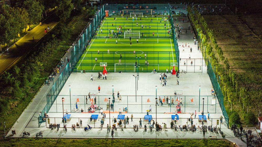 2024年9月21日,居民在山東省寧陽縣城區一處體育公園內運動(無人機照片)。近年來,寧陽縣充分利用城市空閑區域,新建或改建體育健身公園,為居民打造“10分鐘體育健身圈”,讓城市的“金角銀邊”成為全民健身大舞臺。
