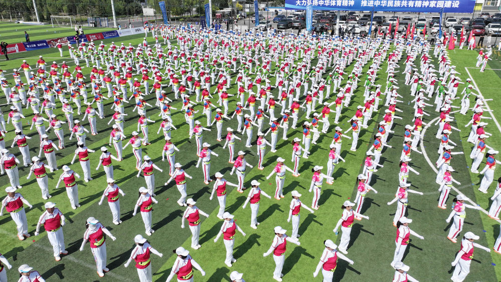 2025年6月10日,群眾在寧夏銀川市金鳳區覽山公園參加千人健身操展演(無人機照片)。當日,紀念“發展體育運動 增強人民體質”題詞73周年全民健身主題活動在覽山公園舉行