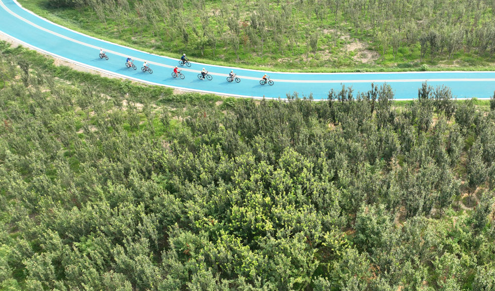 2024年7月10日,自行車愛好者在石家莊市環城綠道北線騎行休閑。近年來,石家莊依托滹沱河、環城水系等優質景觀資源,通過架設橋梁、提升景觀和完善綠地等措施,打造景美、智游、暢達的城市綠道健身體系,加強環城綠道與中心城區串聯銜接,方便市民無障礙步行或騎行,提升群眾生活幸福感和獲得感。