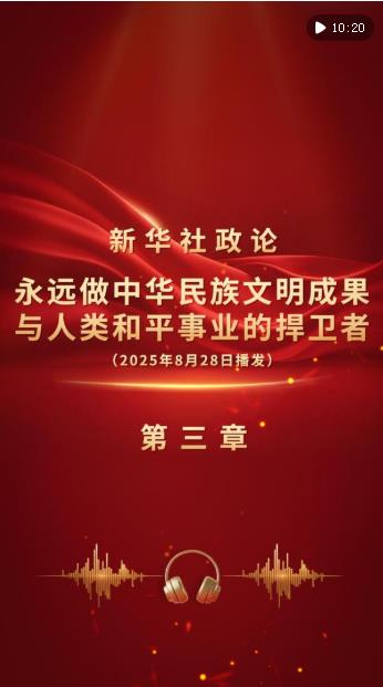 新華社8月28日播發《新華社政論|永遠做中華民族文明成果與人類和平事業的捍衛者——寫在中國人民抗日戰爭暨世界反法西斯戰爭勝利80周年之際》。我們邀請誦讀嘉賓吳樾演播“第三章”。