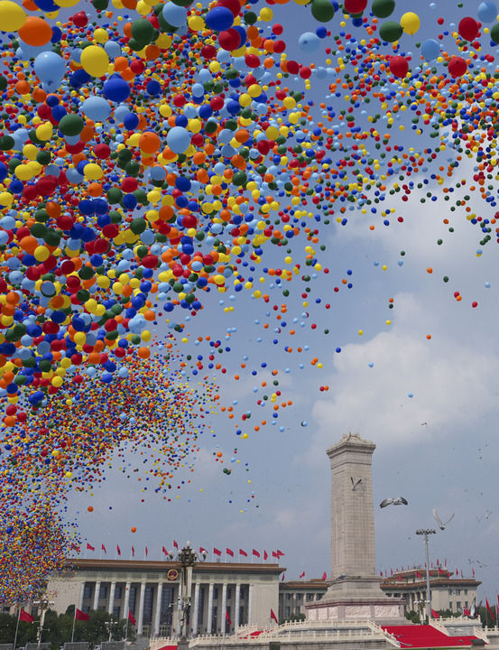 2025年9月3日,紀念中國人民抗日戰爭暨世界反法西斯戰爭勝利80周年大會在北京隆重舉行。這是紀念大會現場放飛氣球和鴿子。新華社記者 牟宇 攝