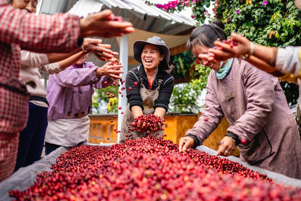 2025年1月8日,在云南普洱思茅區一咖啡莊園,工作人員慶祝咖啡豐收。
