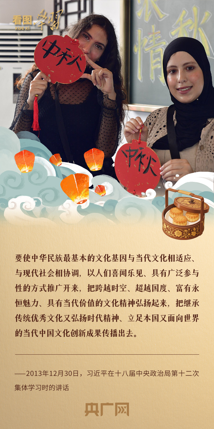 中秋節(jié)是我國(guó)四大傳統(tǒng)節(jié)日之一,承載著中華民族優(yōu)秀傳統(tǒng)文化底蘊(yùn),寄托著中國(guó)人濃濃的家國(guó)情懷和圓滿和諧的美好追求。習(xí)近平總書記曾指出,要“把歷經(jīng)滄桑留下的中華文明瑰寶呵護(hù)好、弘揚(yáng)好、發(fā)展好”。中秋佳節(jié),讓我們一起重溫總書記關(guān)于中華優(yōu)秀傳統(tǒng)文化的深刻闡釋、深情囑托,堅(jiān)定文化自信,更好構(gòu)筑中國(guó)精神、中國(guó)價(jià)值、中國(guó)力量。