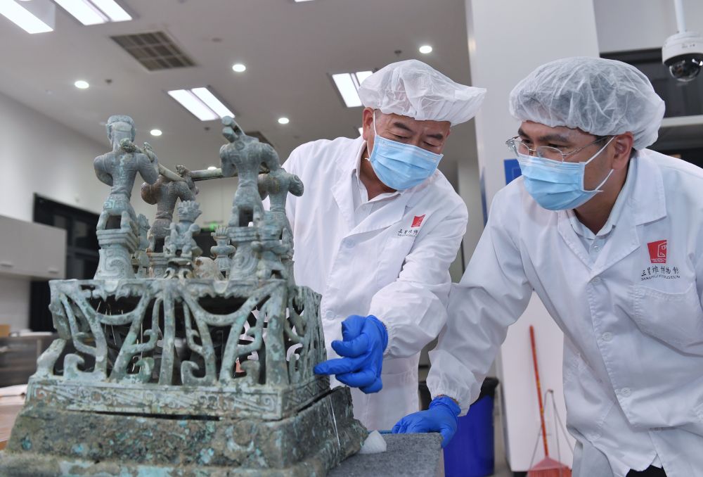 2023年5月30日,在四川三星堆博物館文物保護和修復中心,文物修復師郭漢中(左)與同事討論神壇底座修復方案。郭漢中從事文物修復工作已40余年,深度參與了三星堆祭祀坑的發(fā)掘工作,累計修復文物6000余件。“大概還有上萬件文物等著修復,需要一代接著一代往下干。”郭漢中說,他要把平生所學傳承下去,培養(yǎng)更多人才。
