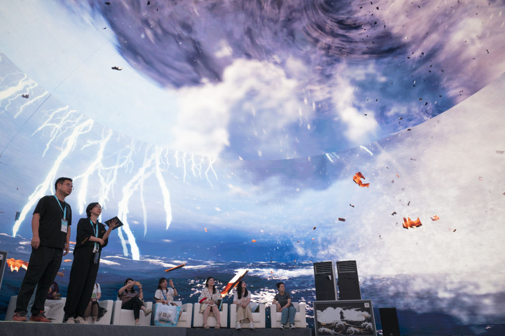 2024年7月22日,游客在“尋境敦煌——數(shù)字敦煌沉浸展”借助VR設(shè)備沉浸式游覽莫高窟第285窟虛擬場(chǎng)景。“尋境敦煌——數(shù)字敦煌沉浸展”綜合運(yùn)用VR虛擬現(xiàn)實(shí)、三維建模、游戲引擎的物理渲染和全局動(dòng)態(tài)光照等新技術(shù),高精度立體還原了莫高窟第285窟。游客戴上VR眼鏡,不僅可以零距離觀賞壁畫(huà)、360度自由探索洞窟細(xì)節(jié),還能“飛升”到窟頂,身臨其境參與壁畫(huà)故事情節(jié),沉浸式感受敦煌文化的魅力。