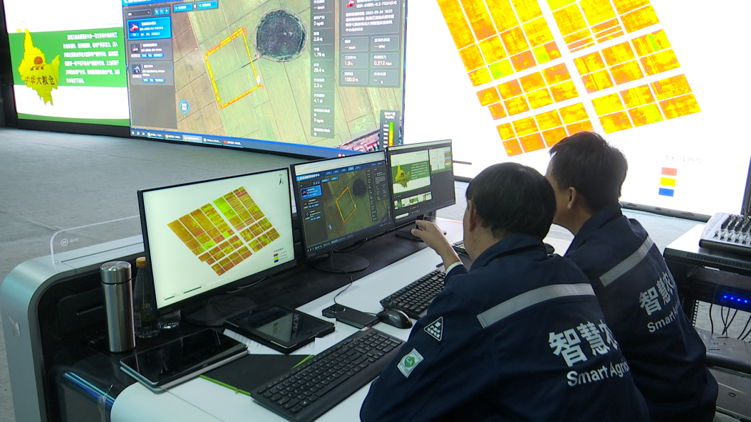 工作人員通過智慧農業數字指揮平臺研判水稻成熟度(央廣網發 李延生 攝)