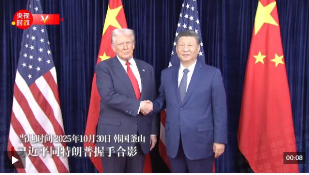 當地時間10月30日中午,中美元首會晤開始前,習近平同特朗普握手合影。