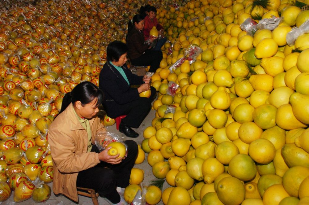 2007年12月1日,廣東省梅縣農民在包裝柚子。