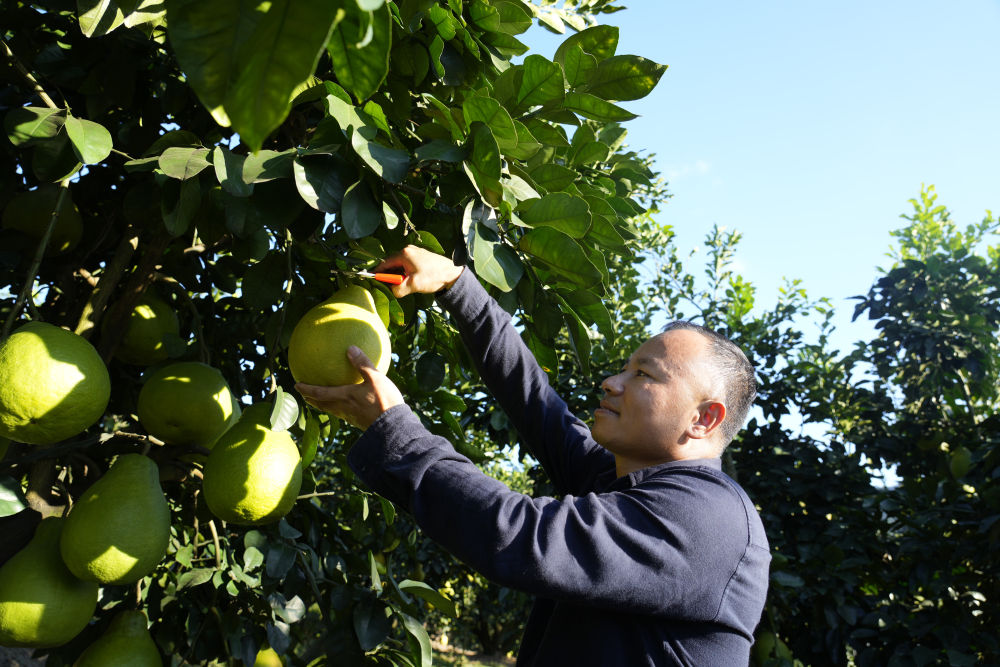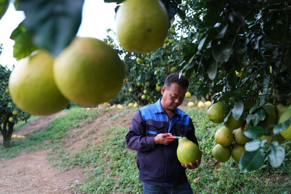 2025年11月7日,柚農在梅州南福金柚種植基地采摘柚子。