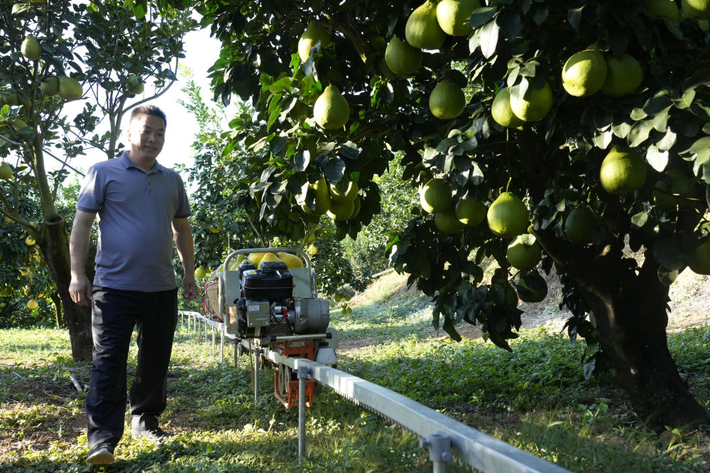 2025年11月7日,在梅州南福金柚種植基地,柚農通過山地運輸車運輸柚子。