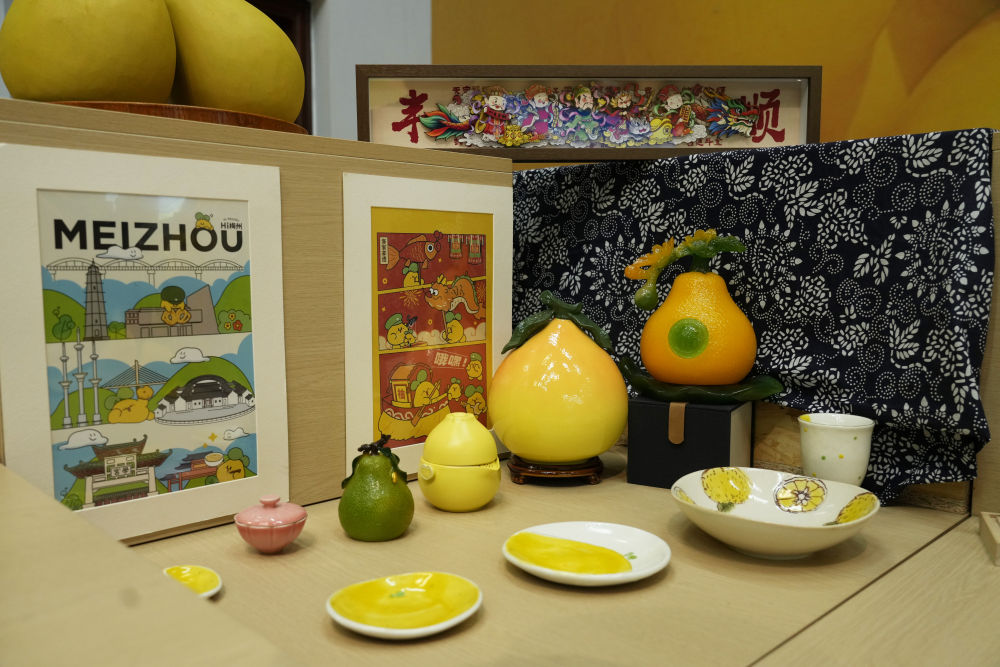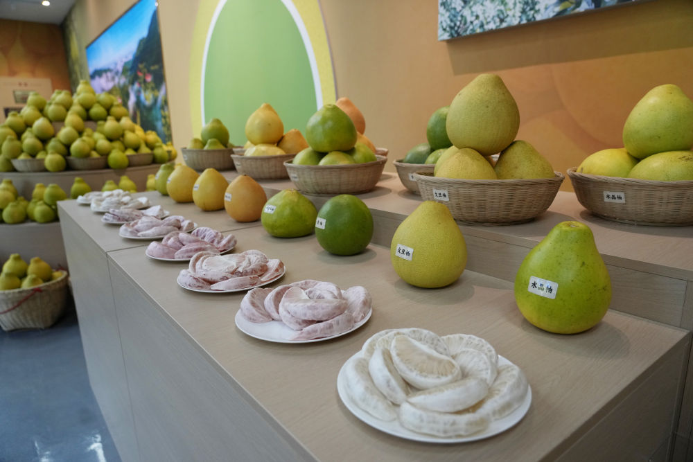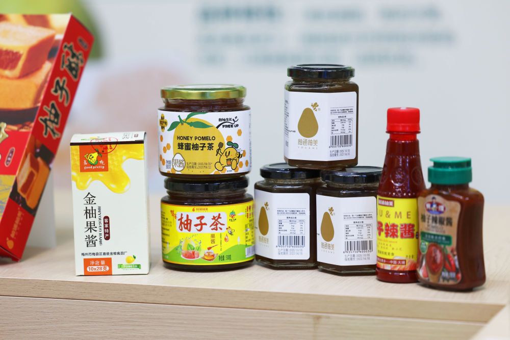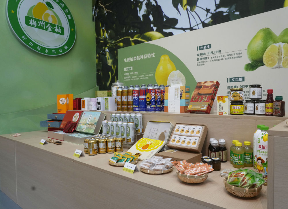 2025年11月7日在梅州南福金柚種植基地拍攝的金柚及相關產品。