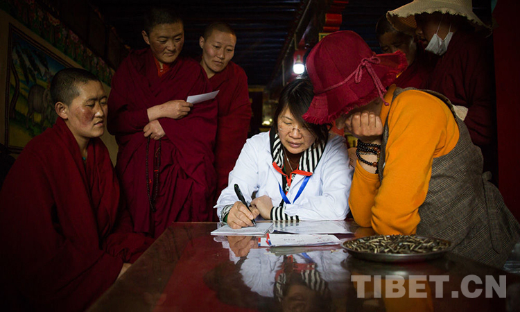 2019年5月,“同心·共鑄中國心” 醫療志愿者在拉薩市羊八井鎮的嘎洛寺,為寺內尼眾進行義診。攝影:趙耀