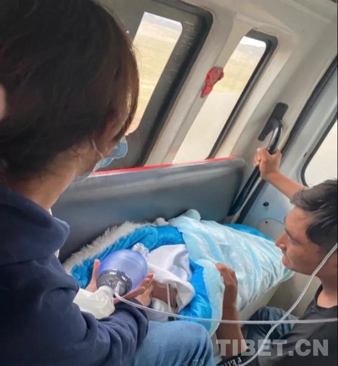 路途的顛簸及病情的反復,患兒在面罩吸氧下血氧飽和度下降至50-60%,呼吸急促、體溫達到39.9℃,并再次出現軀體抽動。醫務人員在轉運途中對患兒加大氧流量并改為持續球囊壓迫給氧,加強物理降溫,繼續予升壓、抗感染、補液等處理,患兒的體溫較前下降,但血氧飽和度仍然不穩定,心率波動大,數次下降至90次/分以下,一度出現室性心律,醫務人員數次給予各項強心、轉律、吸痰等搶救措施,并繼續持續球囊壓迫給氧加強氧合。如此反復,一路救治,患兒和醫務人員終于在次日凌晨一點二十分,抵達西藏自治區人民醫院。