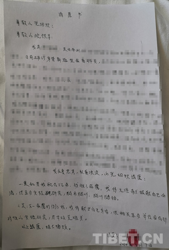 住院期間,索南吉的身份就是病人,對這個未知的疾病難免害怕,好的和不好的結局,她都反復想到了。作為一名參加過2003年非典和2010年甘肅舟曲特大泥石流一線救治工作的醫務工作者、有13年黨齡的共產黨員,她在住院的第2天,便向護士借來了筆和紙,在床頭向醫院鄭重寫下了請愿書:“一是如果我配合治療,戰勝了病魔,我將無償捐獻自己(的)血清,供醫療實驗研究。二是萬一病魔打倒了我,我將獻出自己身體,供相關醫療單位(開展)具有針對性的實驗研究,盡早攻克(新冠肺炎治療的)難關。”