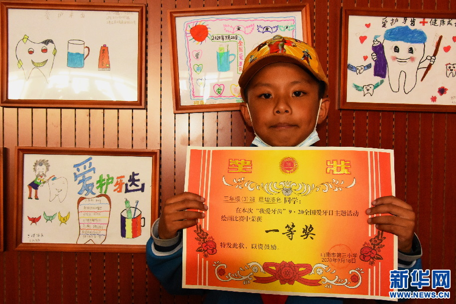 三年級學(xué)生旦增洛色所作的繪畫“愛護牙齒”得了一等獎,現(xiàn)場拿到獎狀的他很是興奮?!笆迨灏⒁虃兘o我們講了很多愛護牙齒的知識,還叮囑我們要養(yǎng)成刷牙的好習(xí)慣?!钡┰雎迳f,“我會把了解到的這方面知識,告訴身邊所有人,讓他們也都有健康的牙齒。”
