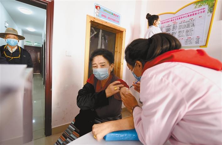 圖為10月27日,在拉薩市城關區吉崩崗街道辦事處衛生服務中心,醫務人員在給老年人接種流感疫苗。記者 洛桑 潘多 攝