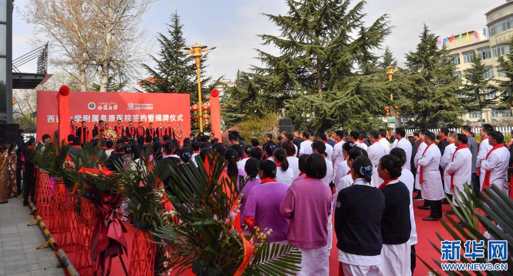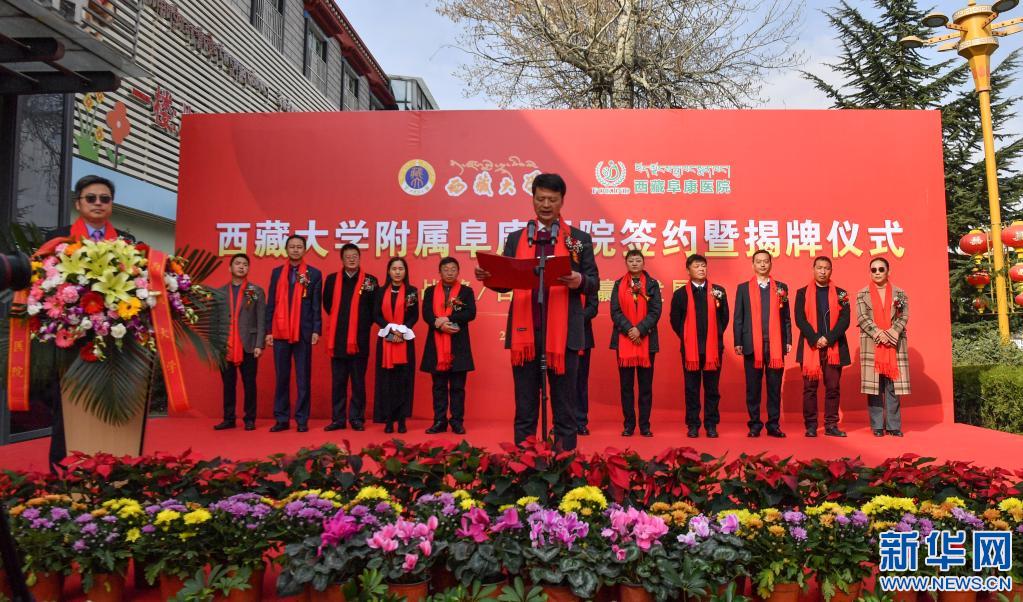 西藏大學(xué)附屬阜康醫(yī)院簽約暨揭牌儀式現(xiàn)場(4月7日攝)。
