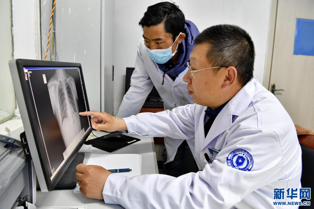 4月21日,山東省煙臺(tái)市第五批援藏醫(yī)療隊(duì)成員趙文雷(右)指導(dǎo)當(dāng)?shù)蒯t(yī)院放射科助理醫(yī)師普布次仁看片。新華社記者 張汝鋒 攝