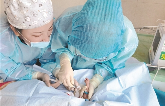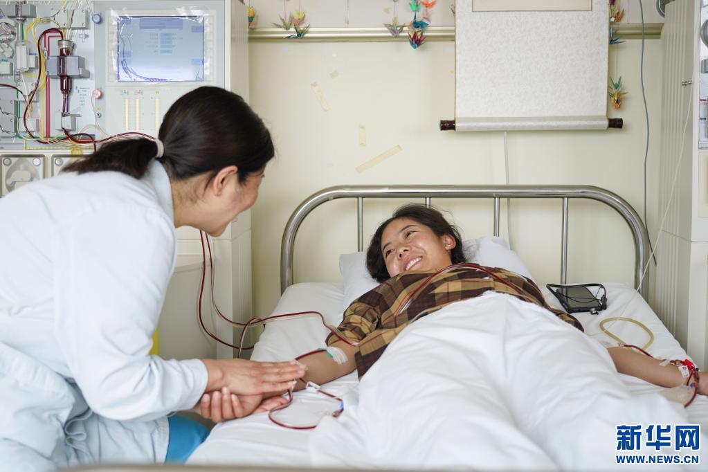醫生摸著拉增的手和她聊天,造血干細胞整個采集時間需要近4個小時(資料圖片)。新華社記者 彭子洋 攝