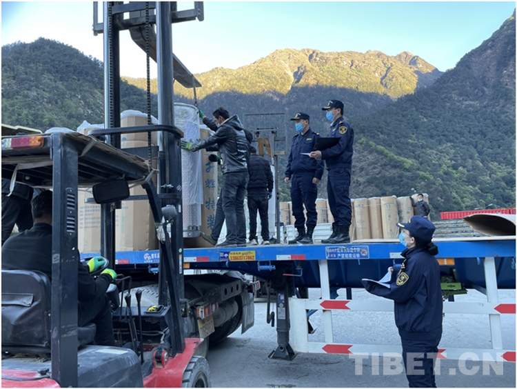 圖為聶拉木海關關員正在對援尼物資進行現場監(jiān)管