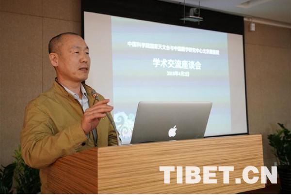 圖為青海省玉樹藏族自治州藏醫藥研究所格列嘉措副所長作《關于藏族天文歷算的學習及思考》報告。攝影:李偉 魯星杞