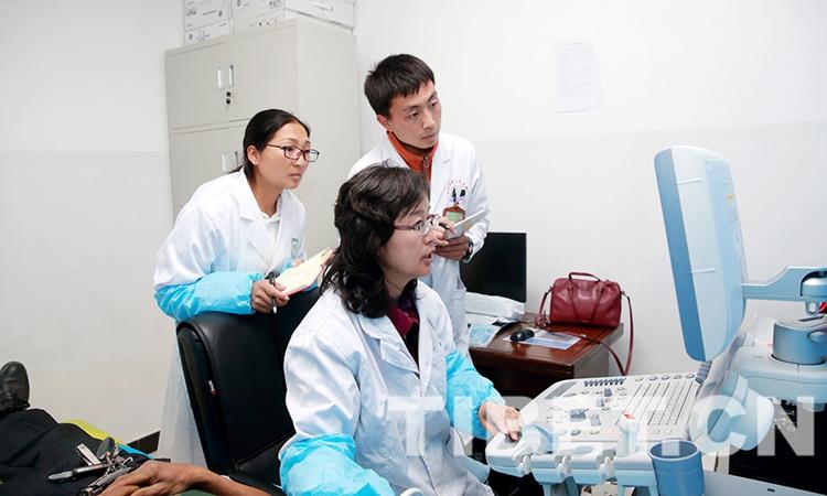 首都醫科大學附屬北京天壇醫院超聲科的何銀鳳給當地的醫護人員演示超聲檢查基本操作。攝影:陳衛國
