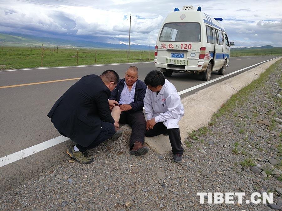 一位老人在路邊揮舞著拐杖攔下了北京醫務專家乘坐的汽車,原來是老人得知北京的醫務專家來歐拉秀瑪鄉義診,本想趕到衛生院去看病,但路程較遠又沒有交通工具,聽其他義診回來的群眾說,下午專家們要到貢周看望手術成功的先心病患者,會路過這里,就一直等在路邊。