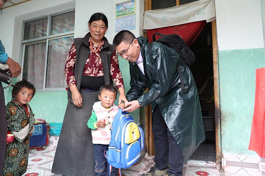 7月10日,瑪曲縣歐拉秀瑪鄉兩天的義診行程即將結束,王現海到藏族同胞家中為孩子們送上學習用品。