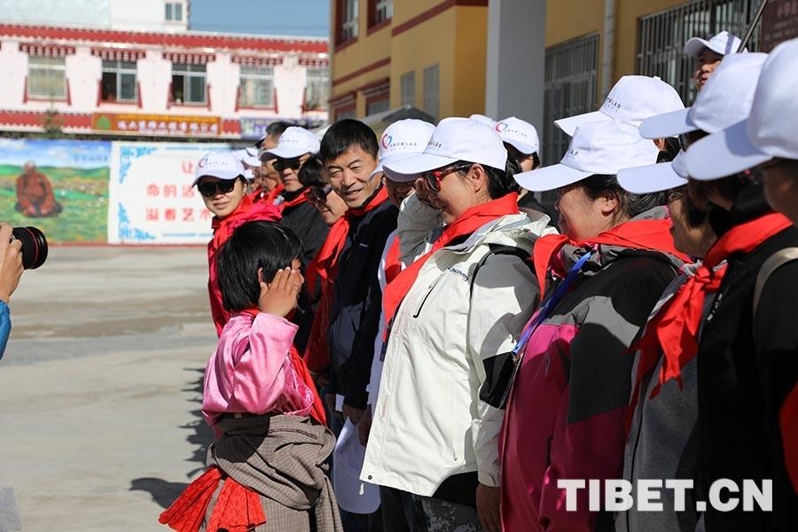 圖為瑪曲縣第一小學學生為專家佩戴紅領巾。