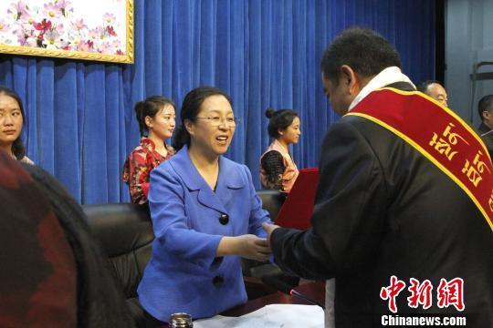 圖為西藏自治區(qū)副主席羅梅向先進集體獲得者頒獎。 趙朗 攝