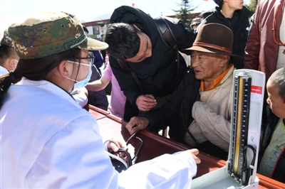 圖為近日,武警西藏總隊機動第二支隊的醫務人員免費為群眾進行診療。丹增群培 攝