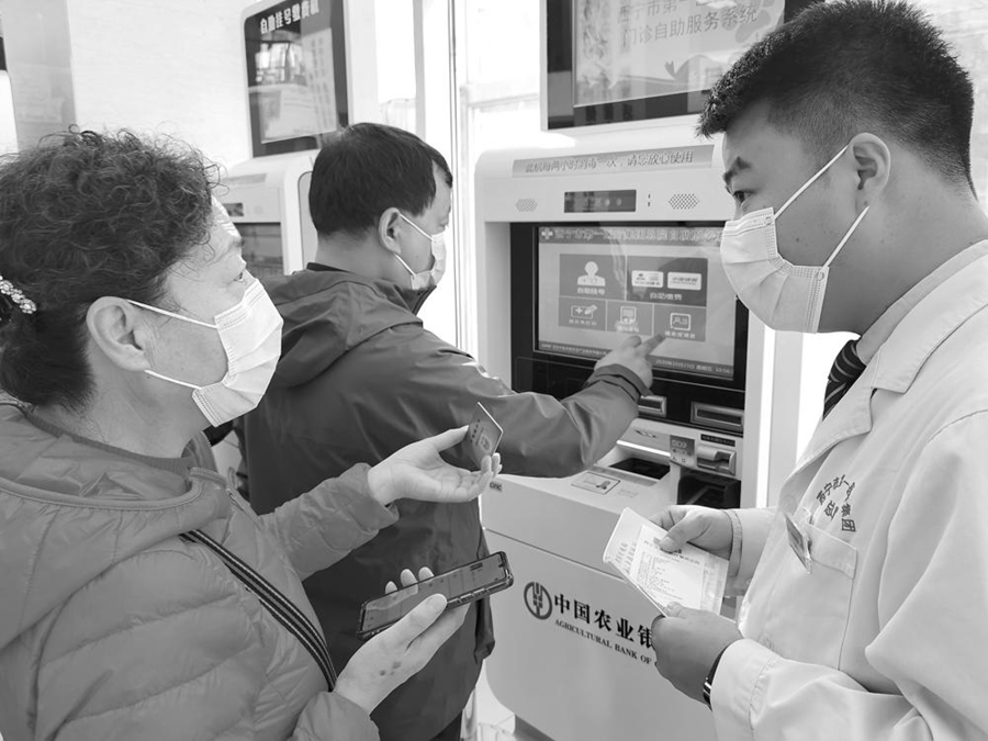 西寧市第一醫療集團總院醫生指導患者使用門診自助服務系統一體機。