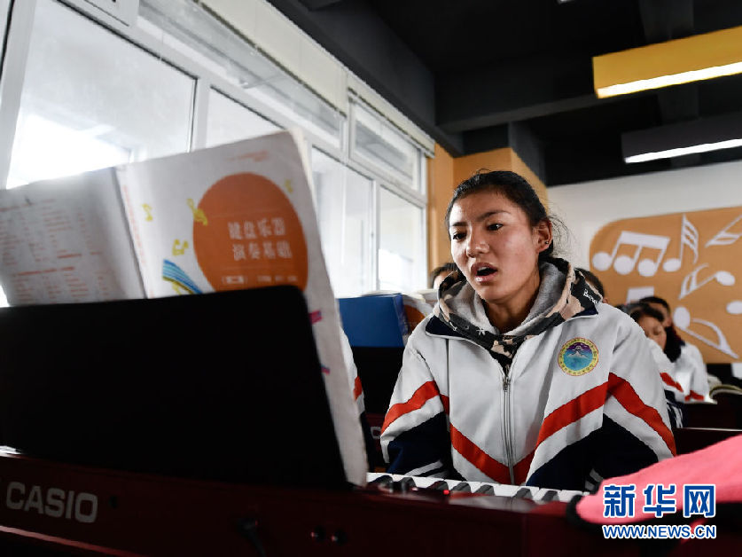 3月16日,在果洛藏族自治州職業技術學校,2020級學前教育專業學生楊央在上音樂課。新華社記者 張龍 攝