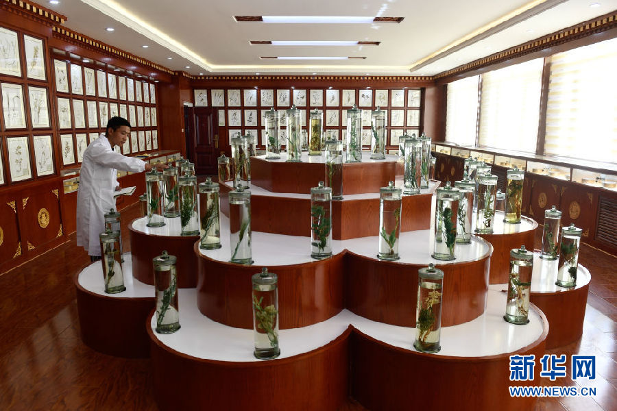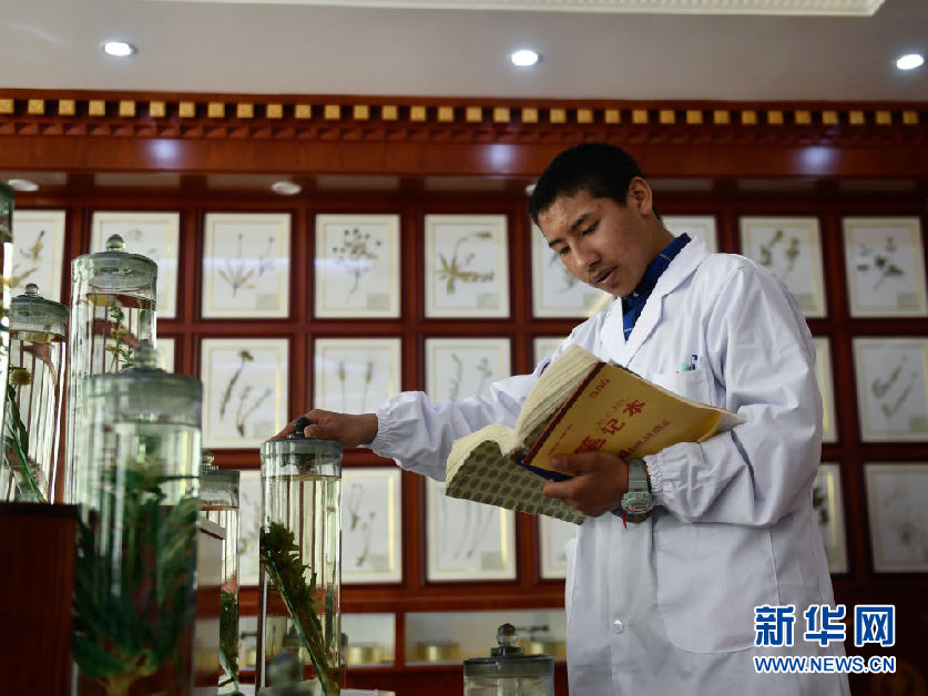 3月16日,在果洛藏族自治州職業技術學校,2020級藏醫醫療與藏藥專業學生德欽多杰在草藥標本館內辨認藥材。新華社記者 張龍 攝